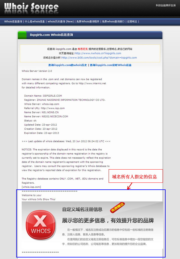 请看 iispgirls.com 的Whois形象广告服务实例:
