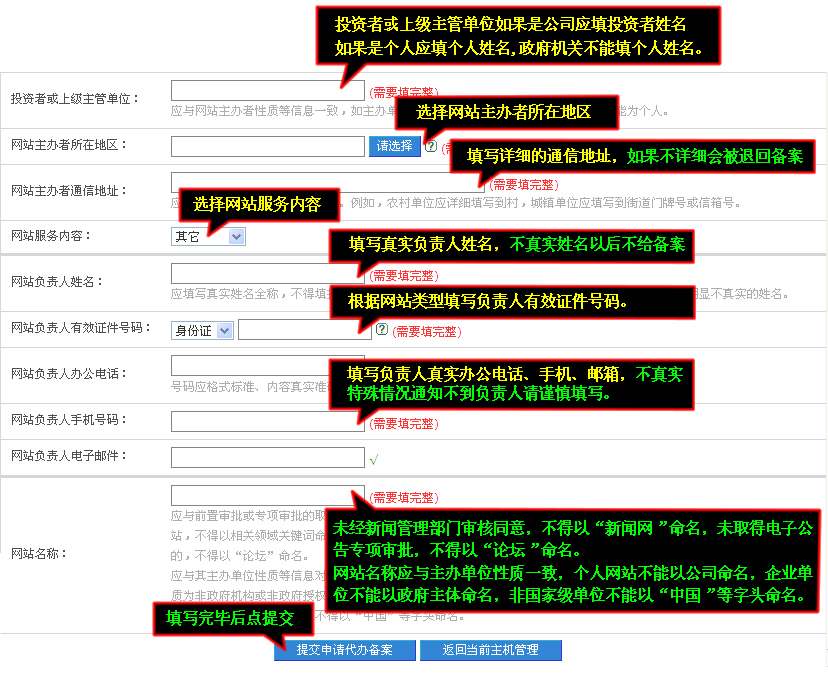 备案信息请如实完整填写,否则信息产业部不给予通过。